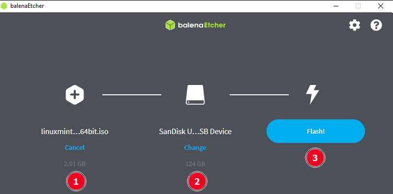 Nun starten wir den 'Balena Etcher', wählen zuerst links die ISO-Datei von Linux Mint aus, in der Mitte dann den USB-Stick (ACHTUNG! Auf jeden Fall das richtige Laufwerk wählen!) und dann können wir auf 'Flash' klicken.