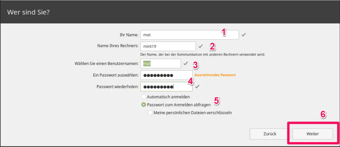 Wir geben dazu in der ersten Zeile (1) unseren echten Namen ein. In der Zeile 'Name ihres Rechners' tragen wir den zukünftigen Namen des Linux Mint Computers ein (2). Der eigentliche (technische) Benutzername kommt in die dritte Zeile (3). Unter Linux ist es üblich Benutzernamen klein zu schreiben. Umlaute und Sonderzeichen sollten wir in Benutzernamen vermeiden.