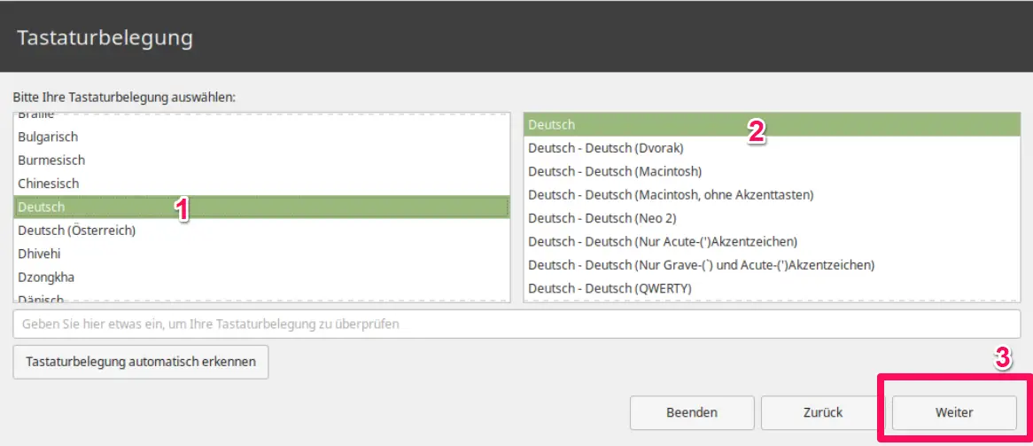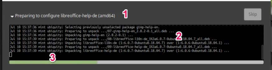 Sofern wir den Ablauf der Mint Installation genauer verfolgen möchten, dann klicken wir auf den kleinen Pfeil links unten (2).