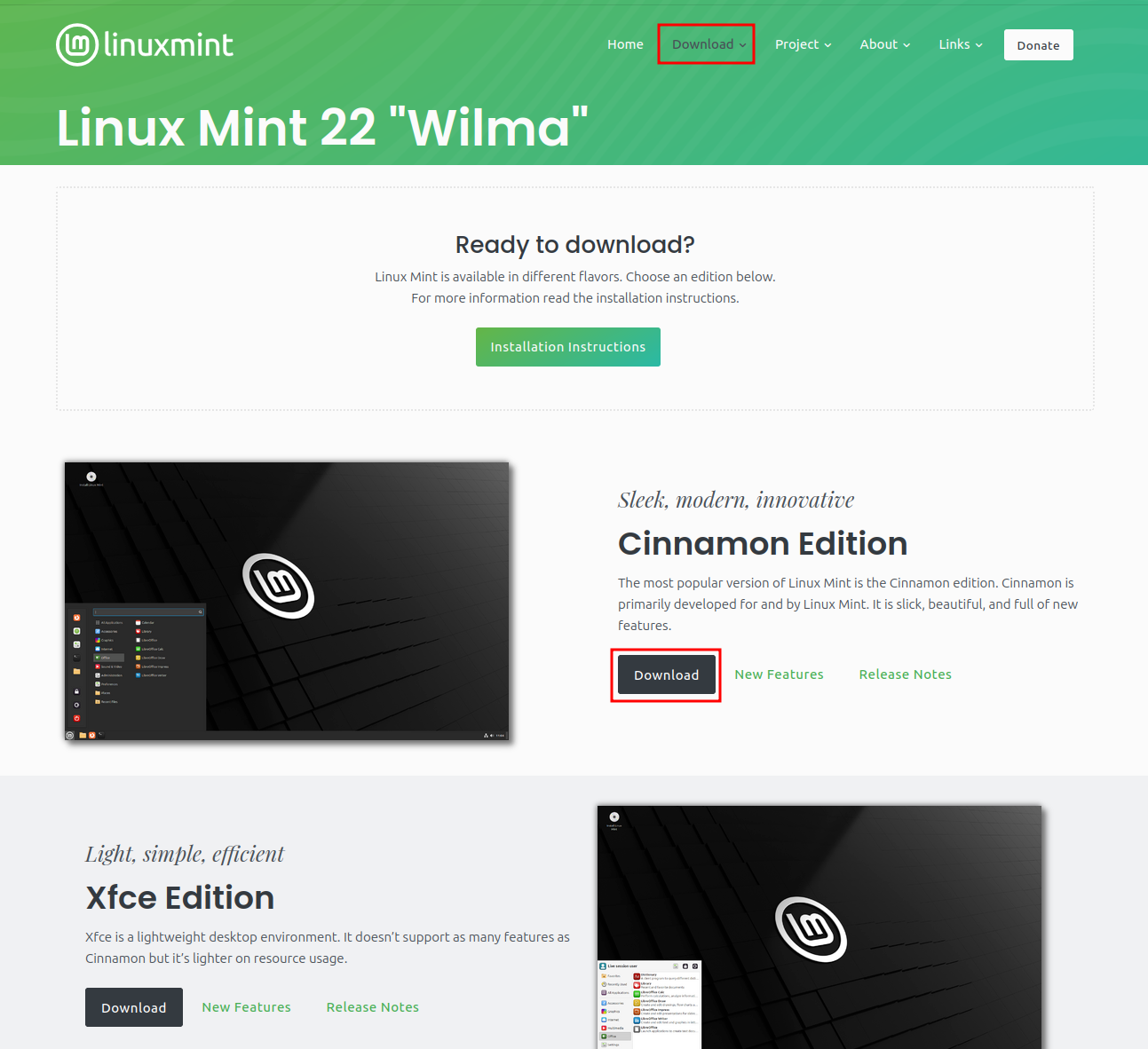 Wir haben die Wahl zwischen 2 Varianten. Wir wählen aber die 'Cinnamon Edition'. Die Verfahrensweise wäre aber mit der "leichgewichtigeren" 'Xfce Edition' die Gleiche!