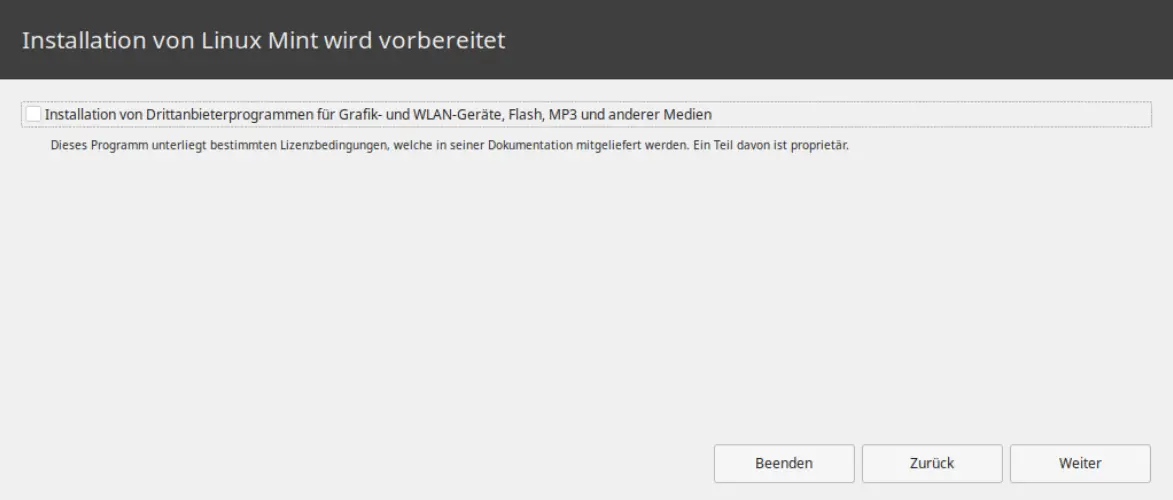 Die Frage nach Drittanbieterprogrammen können wir i.d.R. auswählen und bestätigen: