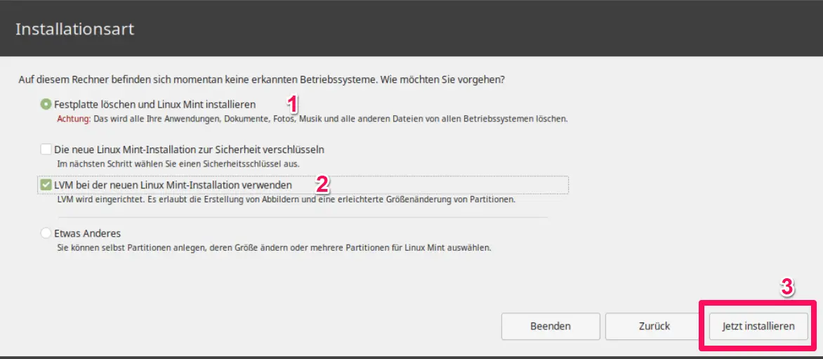 Sofern man die Möglichkeit haben will, die Partition von Linux Mint auf seiner Festplatte bzw. SSD später zu erweitern, sollte man den Haken bei 'LVM bei der neuen Linux-Mint Installation verwenden' (2) setzen. Es wird dann eine Partition mit dem so genannten Logical Volume Manager (LVM) erstellt. Ein LVM können Sie später etwa durch eine weitere Festplatte erweitern. Wenn Sie Linux Mint einfach nur so zum Testen installieren möchten, brauchen Sie den Haken nicht zu setzen.