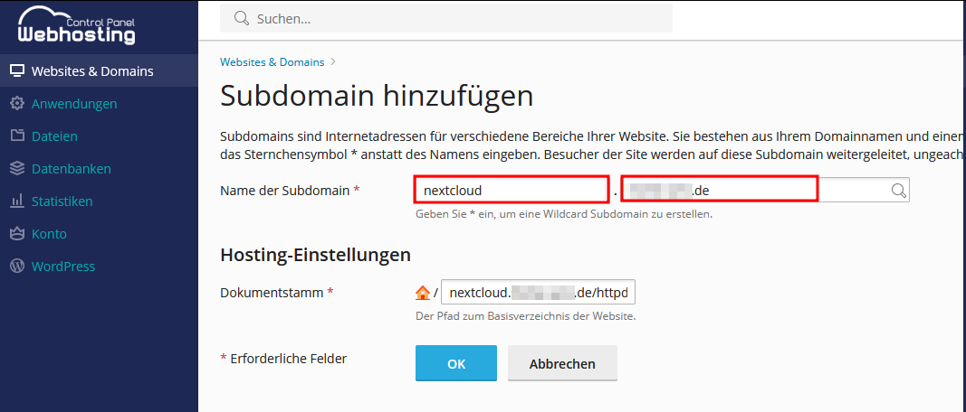 - Host: Subdomain, die wir gerade angelegt haben (hier: "nextcloud")