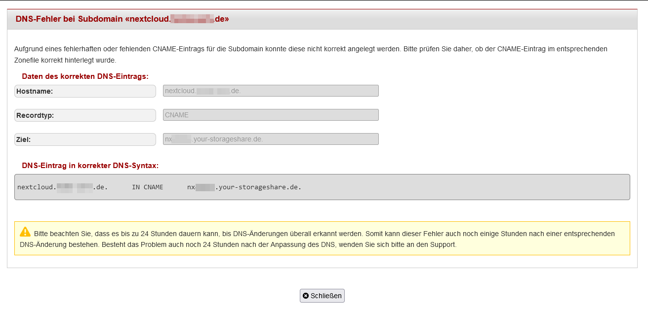 Wenn der DNS-Eintrag im Webhosting noch nicht verarbeitet wurde (bis zu 24-48 Stunden Bearbeitungszeit!), erscheint folgender Fehler: