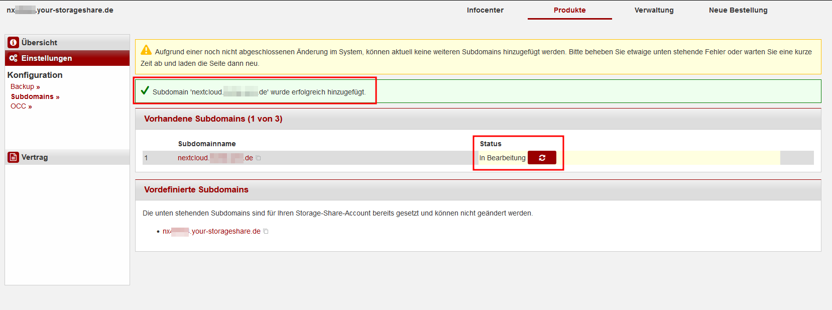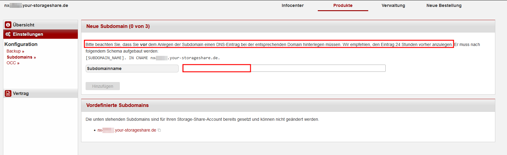 Unter 'Subdomains' kann man ggf. eine Subdomäne eintragen, über die man die HETZNER-Nextcloud erreichen möchte. Natürlich muss man vorher eine Domäne bei einem beliebigen Anbieter gekauft bzw. sich gesichert haben und ggf. dort auch schon eine Subdomäne angelegt haben.