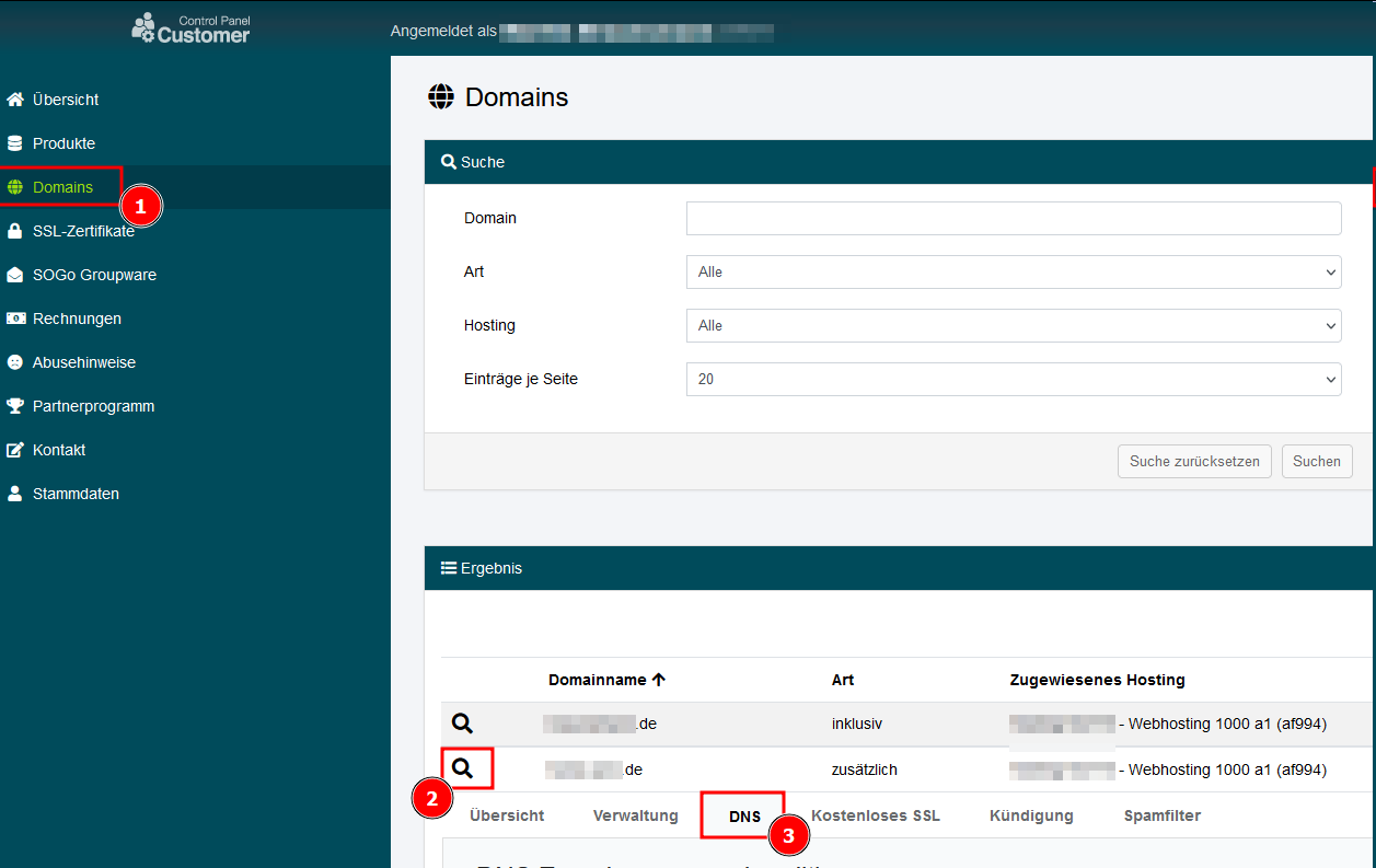 Dazu rufen wir im Menü links die 'Domains' auf und klicken dann auf die Lupe vor der Domäne. Dann klicken wir auf 'DNS':