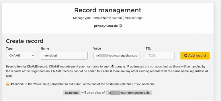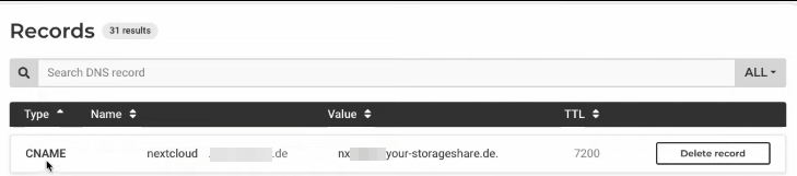 Die gerade angelegte Subdomain muss natürlich noch so eingerichtet werden, dass über diese auch die HETZNER-Nextcloud erreicht werden kann. Es fehlt also noch der entsprechende Verweis, der in Form eines CNAME-Eintrags in den DNS-Einstellungen zur Domäne gepflegt werden kann, zu der auch die Subdomäne gehört.
