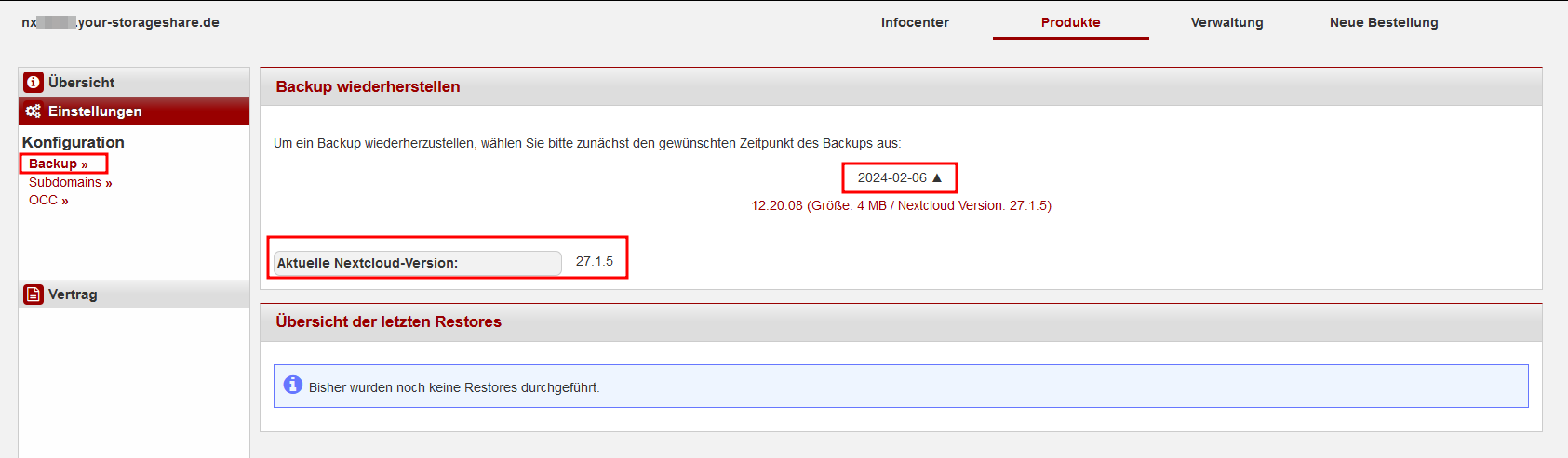 Unter 'Backup' finden sich die letzten automatischen Sicherungen der Nextcloud mit Angabe der Größe und Version zu dem Zeitpunkt. Darunter steht die aktuelle Nextcloud-Versionsnummer.