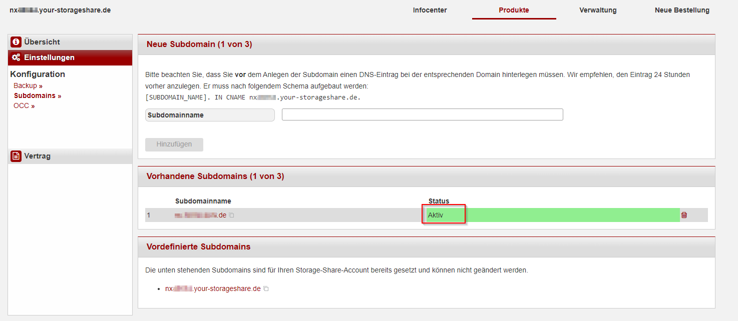 Kurz danach ist die Subdomain angelegt und man kann den DNS-Eintrag dazu pflegen (ebenfalls im Webhosting des Anbieters).