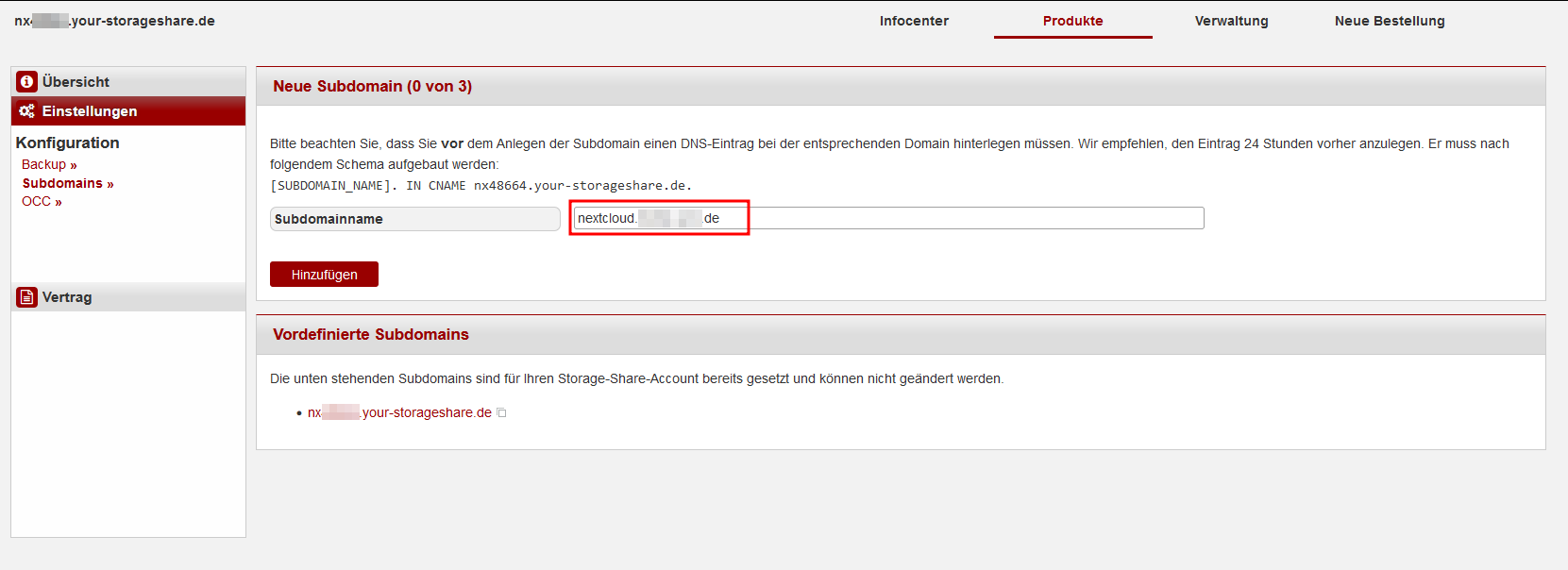 Unter der URL https://konsoleh.hetzner.com kann in den Einstellungen unter dem Punkt 'Subdomains' die Subdomain gepflegt werden, unter der die Nextcloud alternativ zur etwas kryptischen, automatisch erzeugten erreicht werden soll: