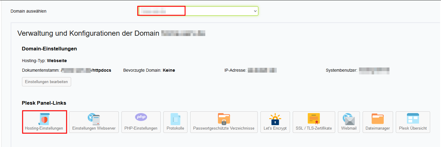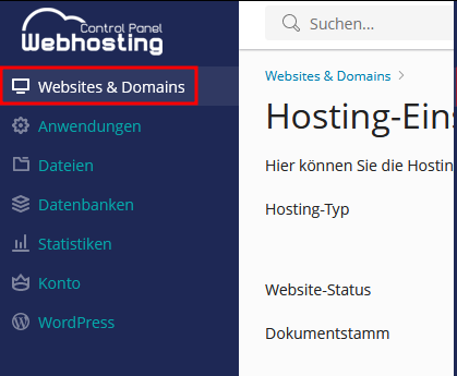 Dort wählen wir die Domäne aus, und klicken auf 'Hosting-Einstellungen':