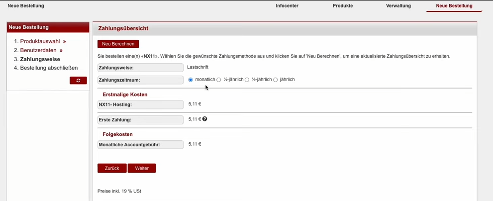 Daraufhin kann man die Zahlungsweise prüfen und klickt erneut auf 'Weiter':