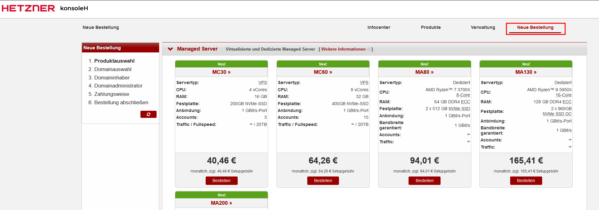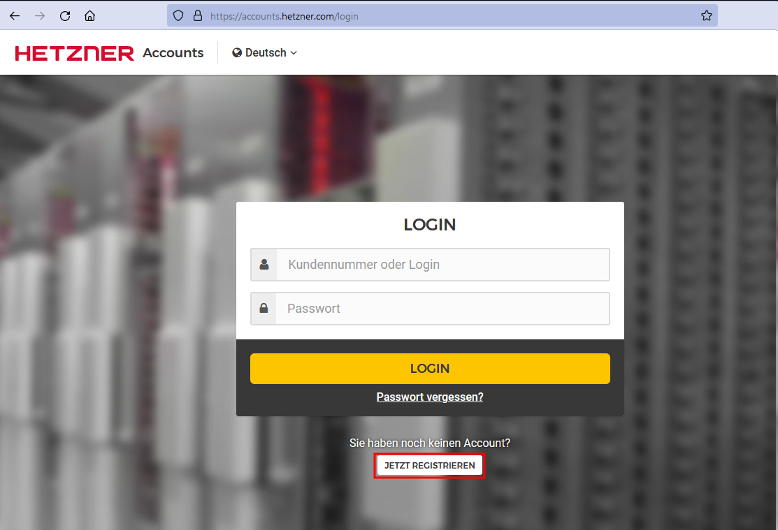 Man muss sich zunächst einen Account bei HETZNER anlegen. Zur entsprechenden Seite gelangt man, indem man auf 'Jetzt loslegen' klickt.