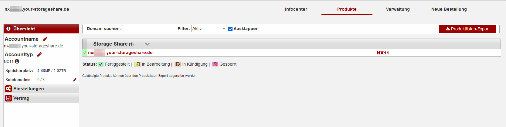 Links wird der Accountname, Accounttyp (Produkt), der aktuell verbrauchte Speicherplatz und die Anzahl der genutzten/eingerichtete Subdomains angezeigt.