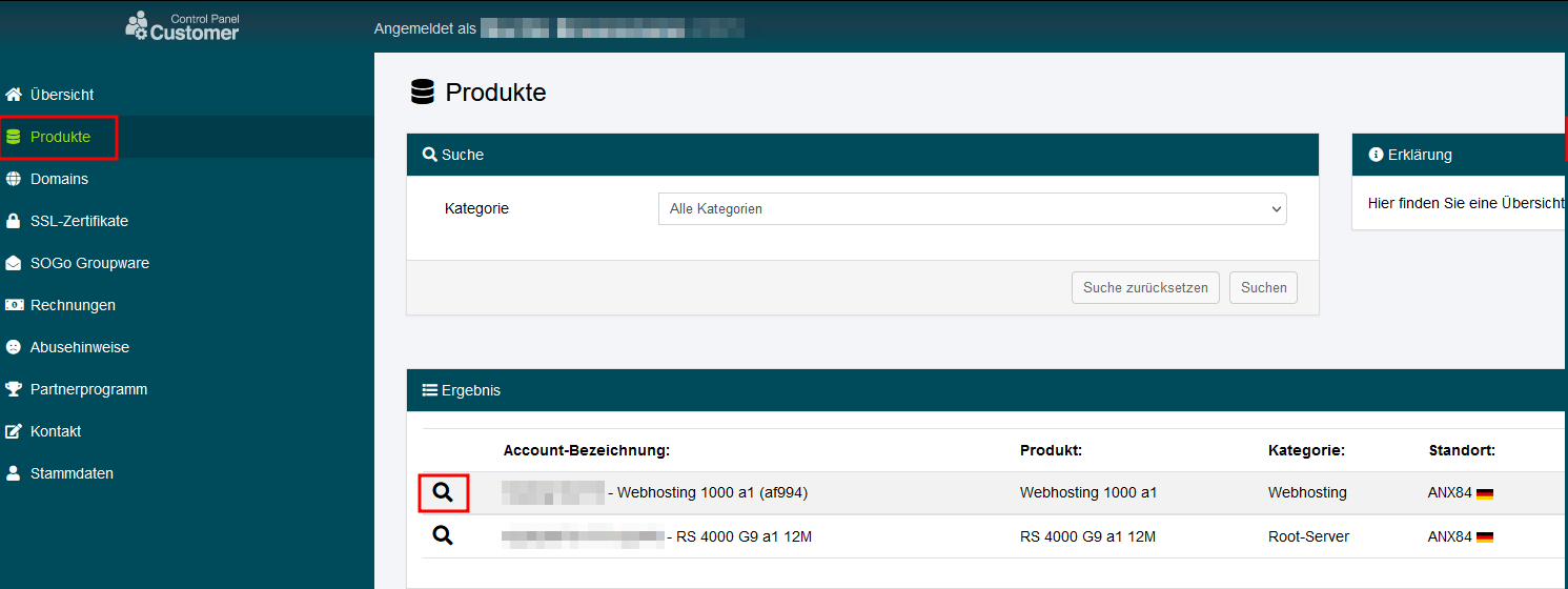- Klicken auf die Lupe vor dem Webhosting-Paket, zu dem man die Domäne gekauft und zugeordnet hat