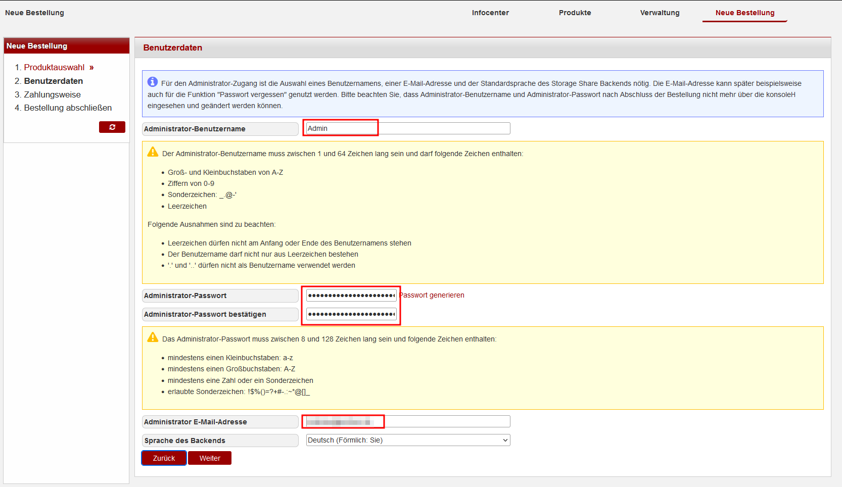 Nun gibt man schon die Zugangsdaten und E-Mail-Adresse ein und klickt auf 'Weiter':