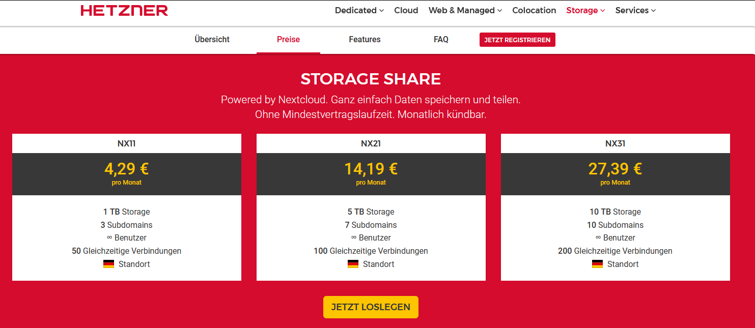 Hetzner bietet über folgenden Link Angebote über eine Nextcloud mit diversen Speicherplatzoptionen etc. an: