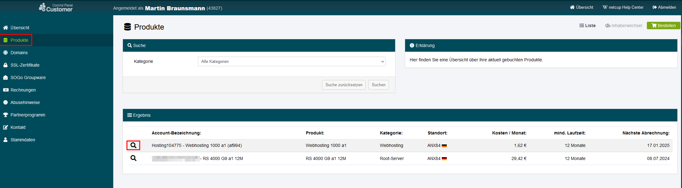 - Klicken auf die Lupe vor dem Webhosting-Paket, zu dem man die Domäne gekauft und zugeordnet hat