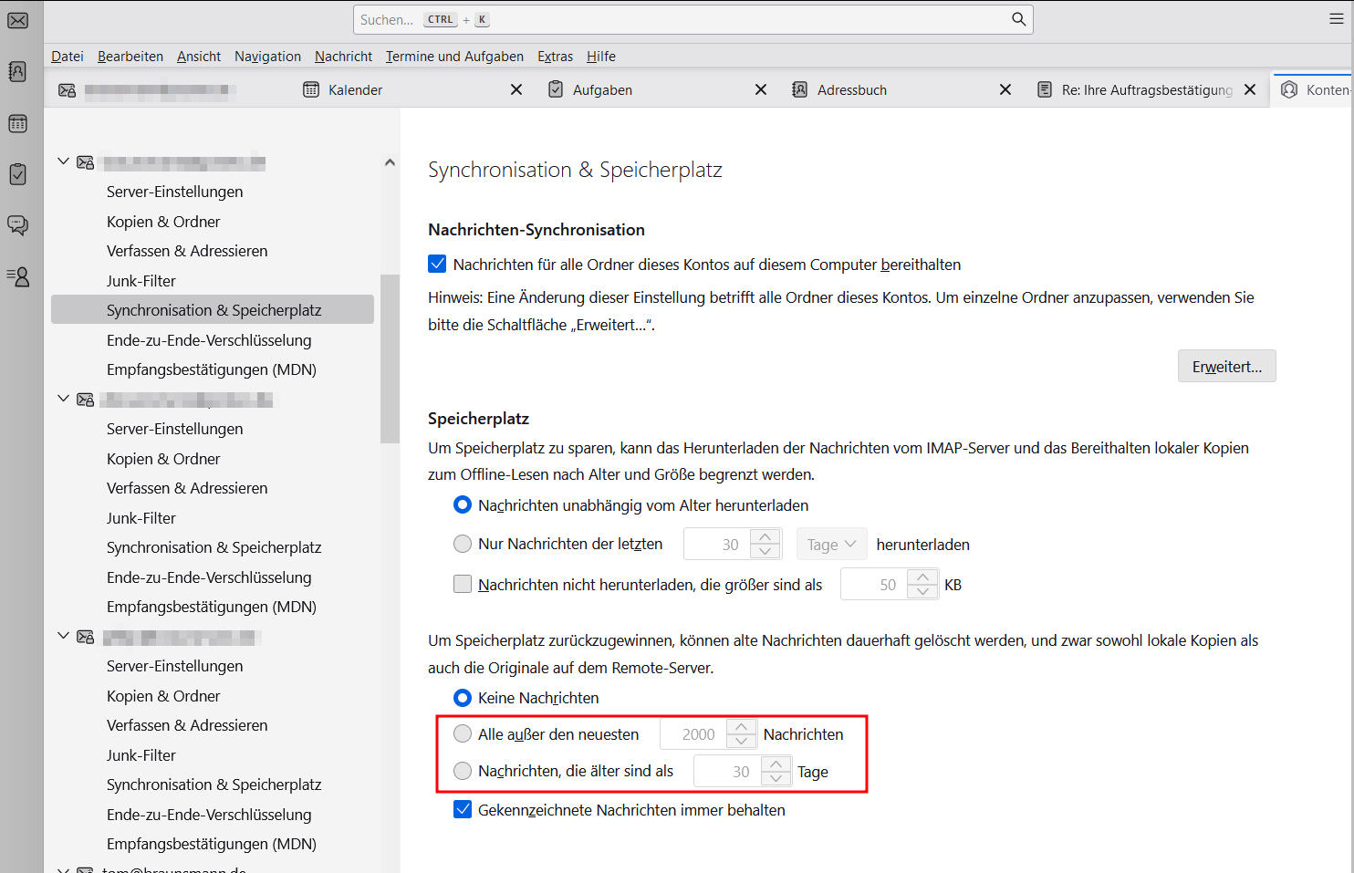 Im E-Mail-Programm Thunderbird gibt es folgende Einstellung, die ältere E-Mails bei Bedarf automatisch löscht: