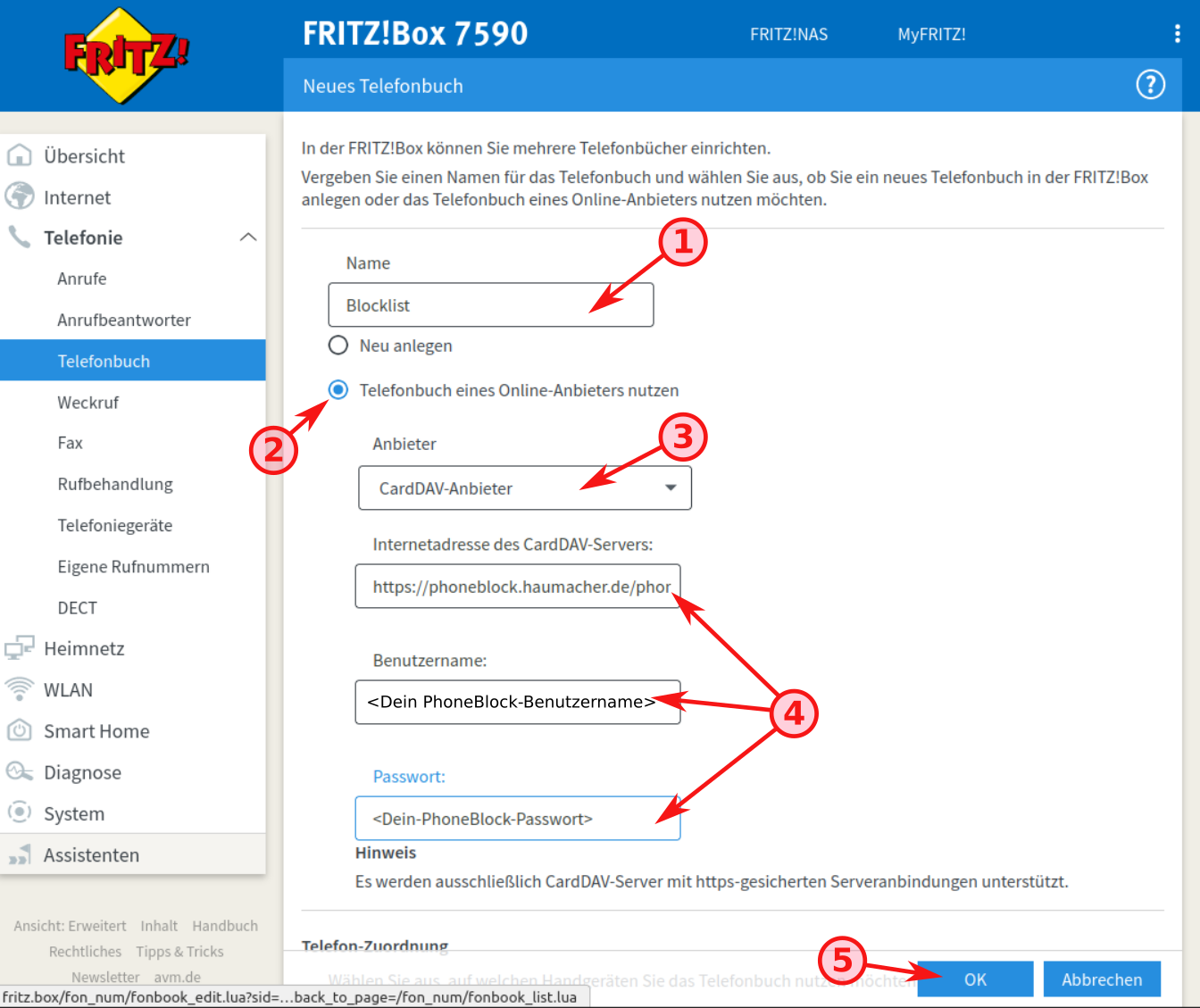 Eintragen Anmeldedaten PhoneBlock-Account