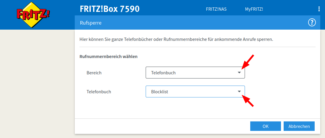 In der Rubrik 'Telefonie / Rufbehandlung' kannst Du jetzt das neue Telefonbuch 'Blocklist' als zu sperrenden Rufnummernbereich festlegen.