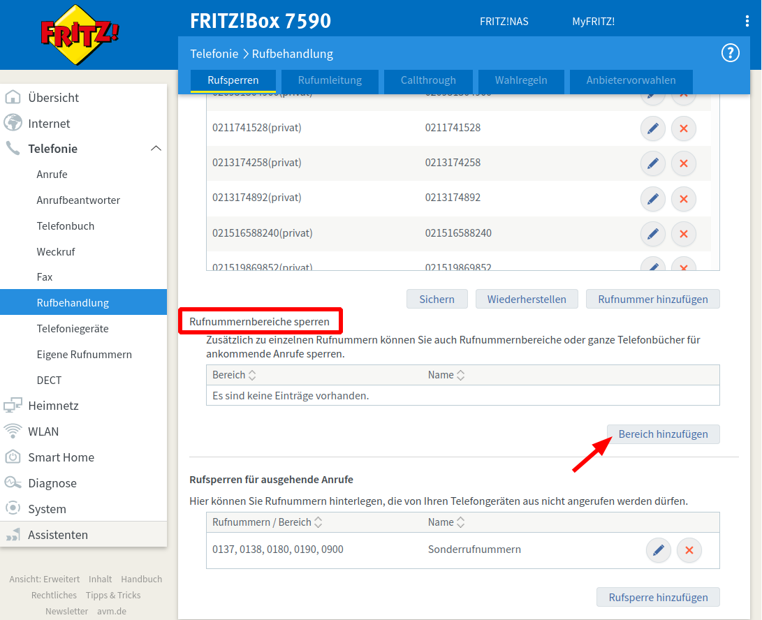 Scrolle nach unten bis zu dem Unterpunkt 'Rufnummernbereiche sperren' und klicke den Knopf 'Bereich hinzufügen'.