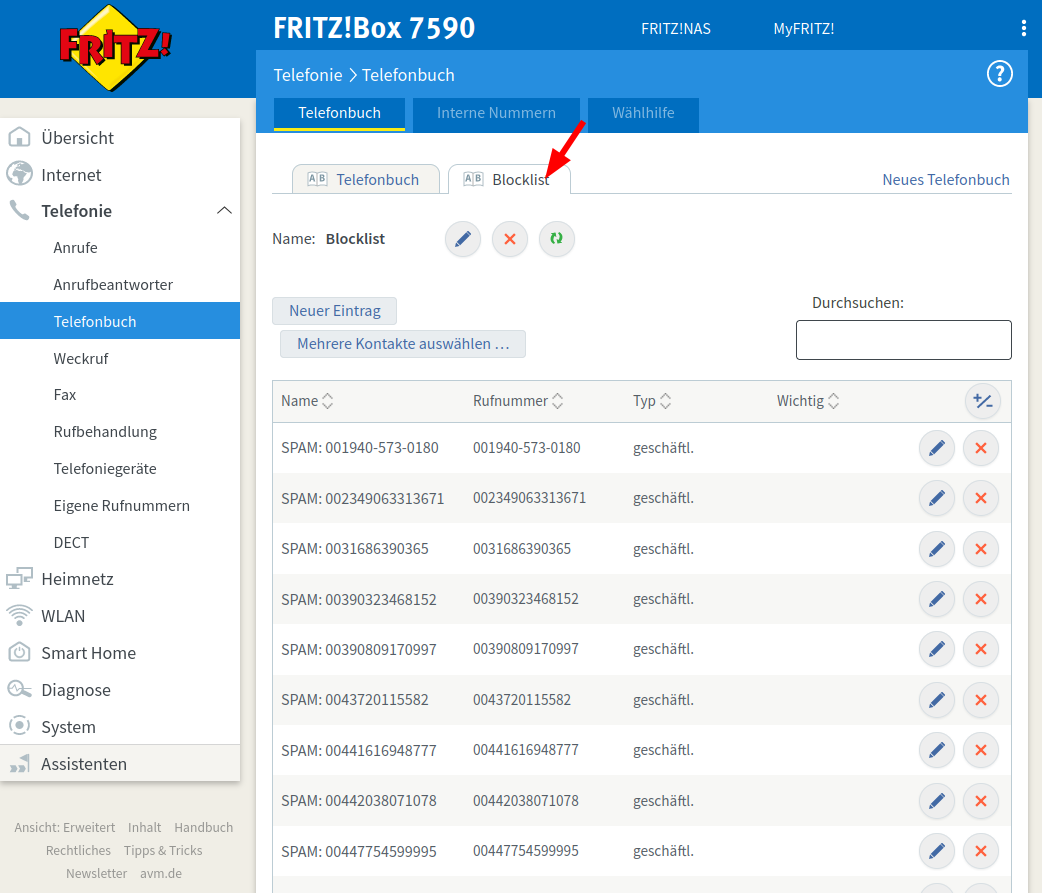 Wenn alles geklappt hat, dann hat Deine FRITZ!Box alle Nummer aus der PhoneBlock-Sperrliste geladen. Du müsstest jetzt ein neues Telefonbuch "Blocklist" in der Rubrik "Telefonie / Telefonbuch" haben. Wenn Du den Reiter "Blocklist" auswählst, kannst Du alle Nummern von aktuellen Spam-Anrufern sehen.