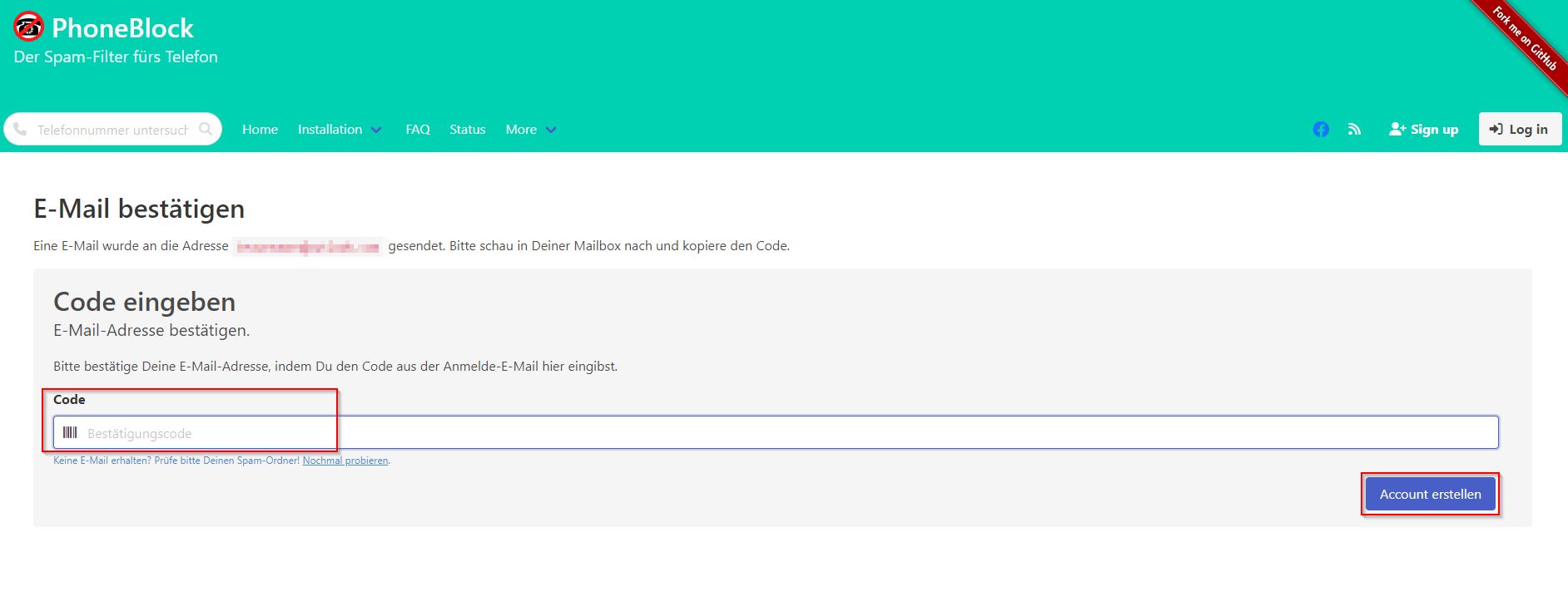 Zunächst muss ein Konto auf der PhoneBlock-Webseite eingerichtet werden: