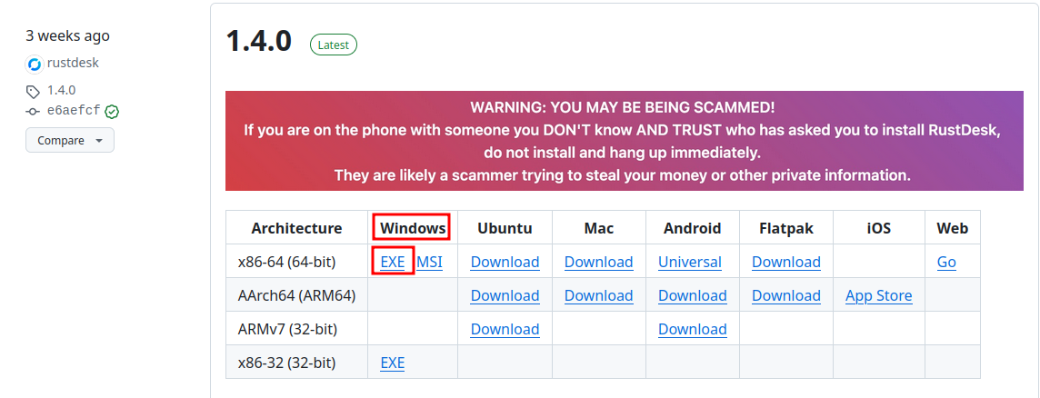 - Windows (64 Bit): https://github.com/rustdesk/rustdesk/releases/download/1.4.0/rustdesk-1.4.0-x86_64.exe